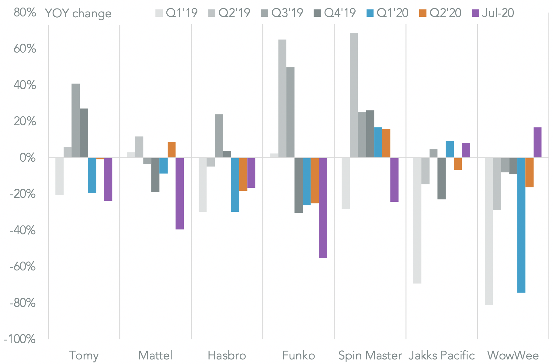 The outliers have been WowWee and Jakks Pacific with growth of 16.8% and 8.2% respectively, though both had cut shipments in Q2 and so may have had more manageable inventory positions to start with.