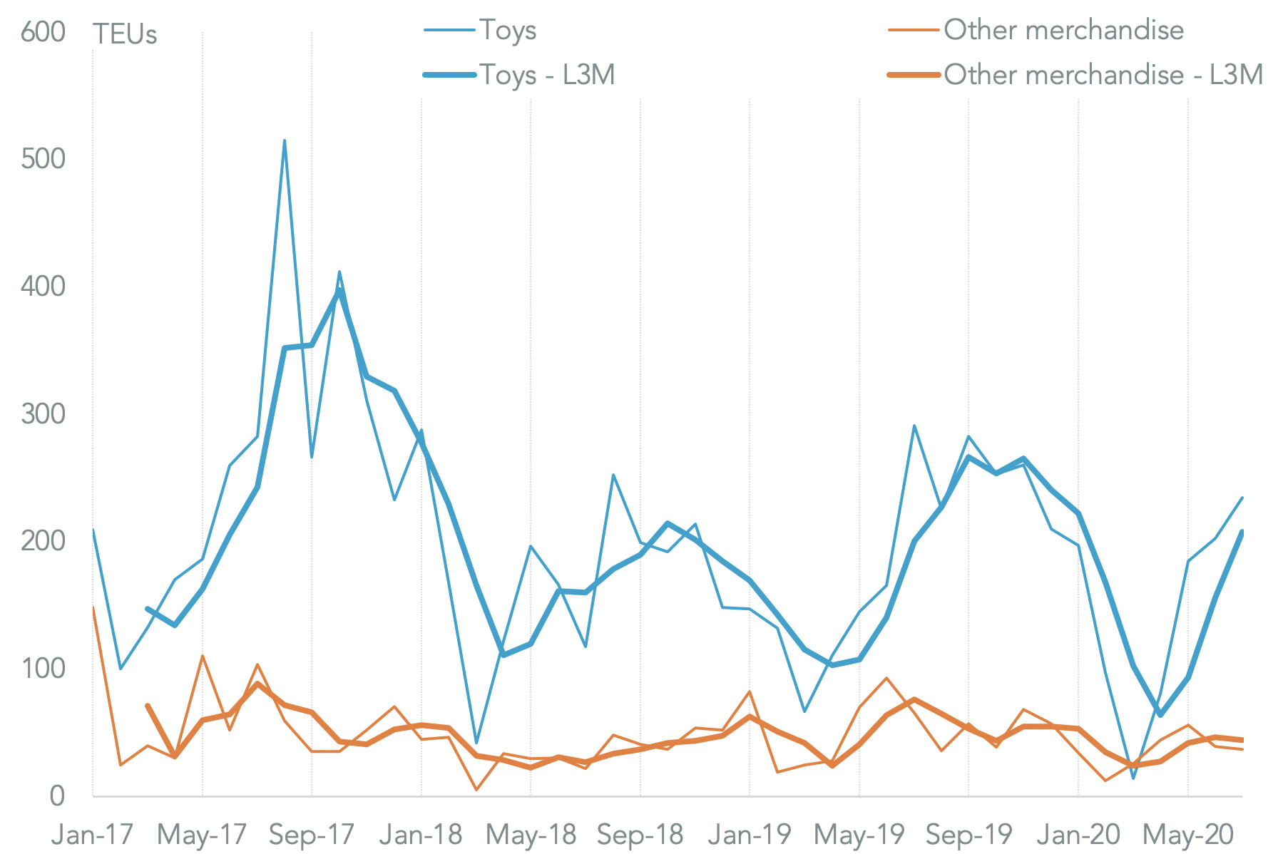 Among the smaller, more brand-focused suppliers there was a 55.0% cut in imports linked to Funko and a 24.2% drop in shipments linked to Spin Master, ending the latter’s extended growth.