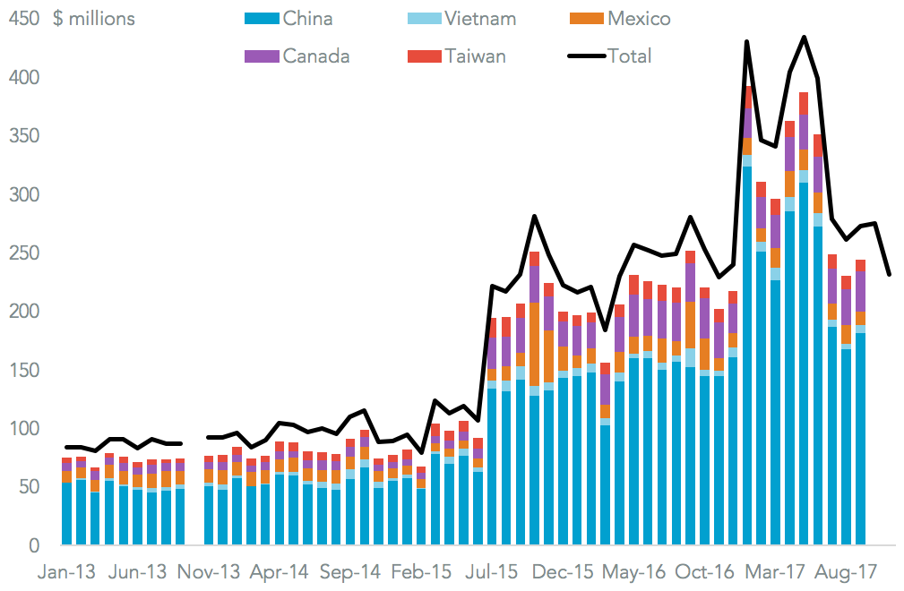 As often occurs the case has been largely successful in cutting, but not completely suppressing, imports. Panjiva data shows imports fell 37.0% in the three months to November 23 vs. the second quarter, which represented the peak of supplies. The latter point is notable – the peak came after the case was announced as suppliers seek to preempt tariffs.