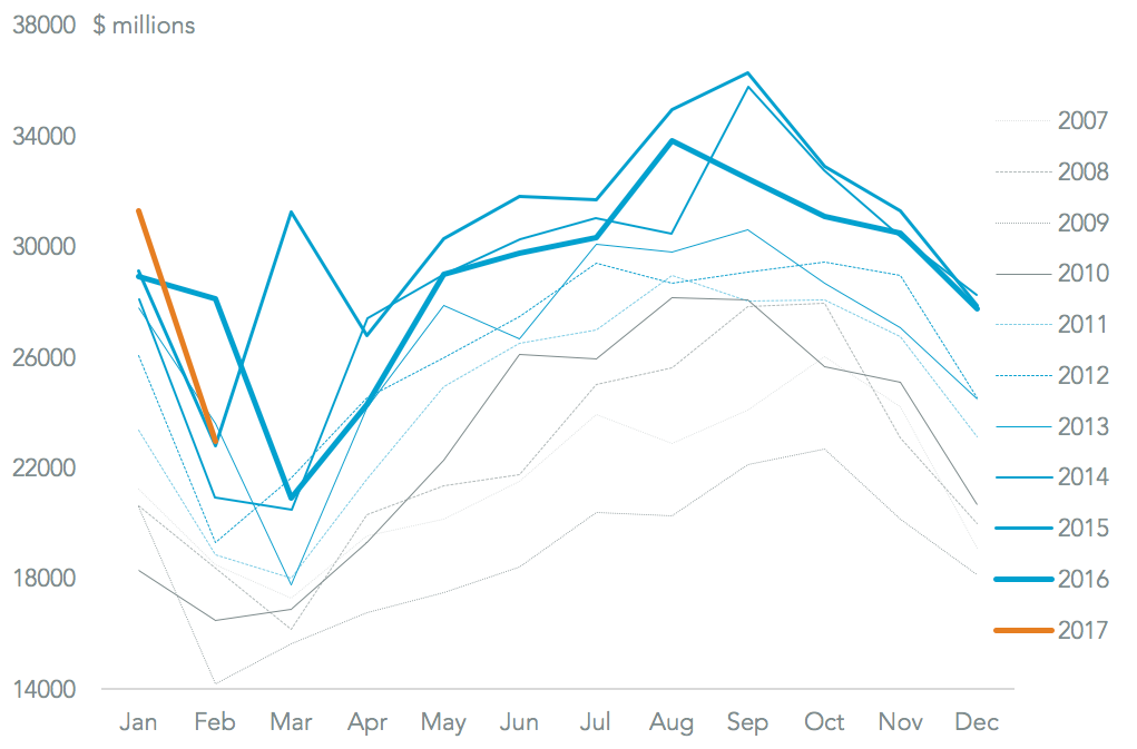Meetings between President Xi and President Trump were focussed on relationship building as much as firm measures. In briefings afterward Commerce Secretary Ross highlighted a 100 day program with “hopefully way stations of accomplishments” to improve the balance in trade between the two. The U.S. focus on reducing the trade deficit, including increased exports, is not a surprise, though China also wants to cut the surplus as it is distorting domestic monetary policy according to the Wall Street Journal.