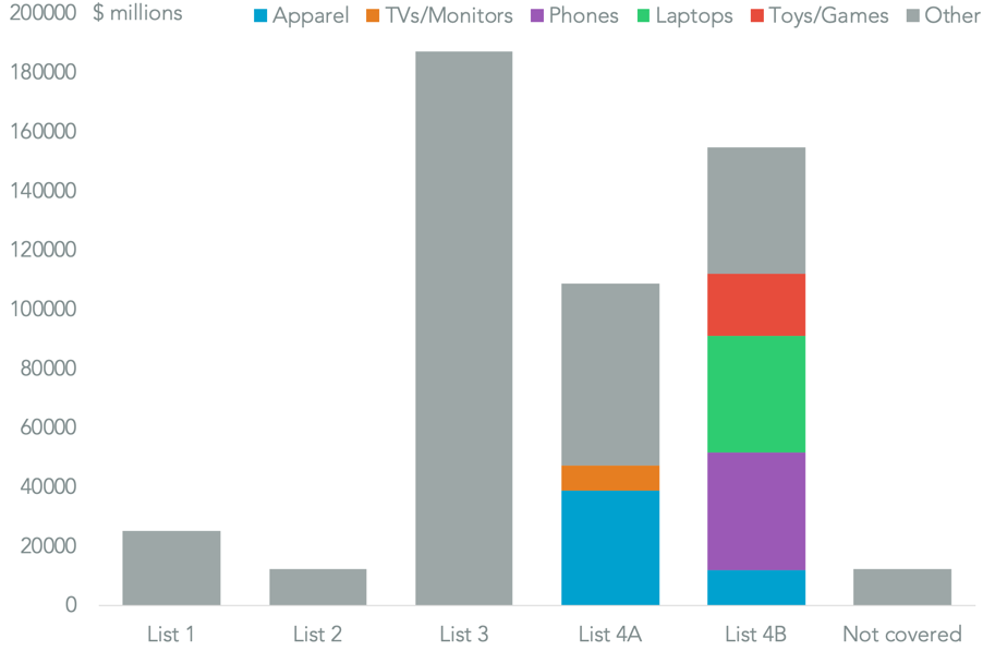 For list 4B meanwhile imports were worth $154.8 billion, and were led by phones ($39.9 billion), laptops ($39.1 billion), toys / games ($21.3 billion) as well as the remaining apparel items ($11.9 billion). Notably there’s $12.2 billion or products not covered including medical devices.