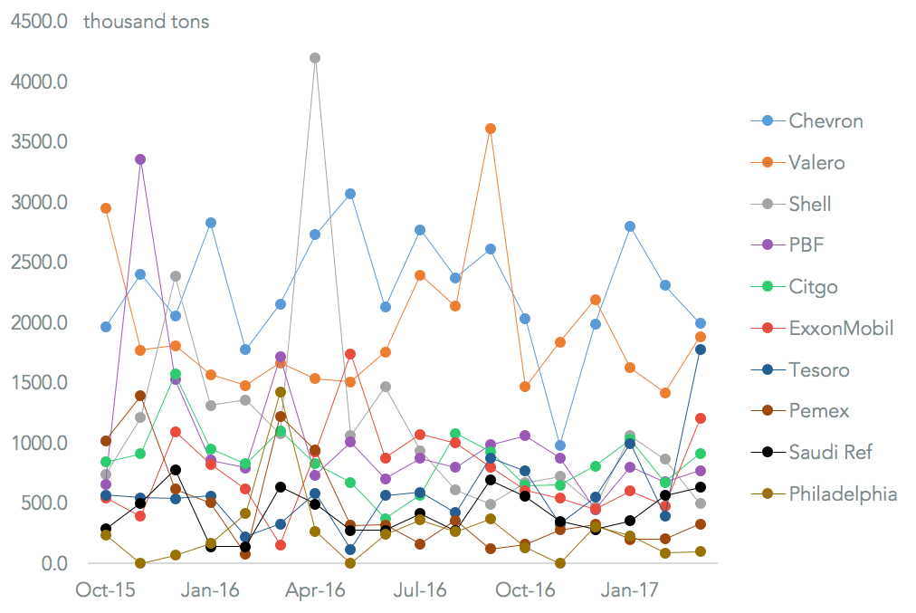 Imports from outside Canada and Mexico may have lost out significantly in March. While seaborne shipments rebounded 26.0% vs. February they were 23.4% lower than a year earlier. Among major consignees the reduction was led by Shell (53.9% down) and PBF Energy (55.0% below a year earlier). The outlier, however, was Tesoro which 5.45x as much as a year earlier to reach its highest on record. That came as it completed its acquisition of Western Refining