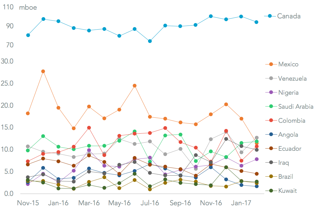Unfortunately in the context of the “OPEC independence” concept, imports from Mexico fell significantly, with a 22.7% fall on a year earlier. That resulted in the lowest exports to the U.S. since at least 2009. That was exacerbated by a drop in Mexican exports to other countries with the result that total shipments fell 25.7%. While Canada remained the largest shipper, imports from OPEC members increased too including Saudi Arabia (17.4% higher) and Venezuela (52.8% above year-earlier levels). That was despite a reduction in OPEC output in January, which may be extended through the second half of the year according to Bloomberg.