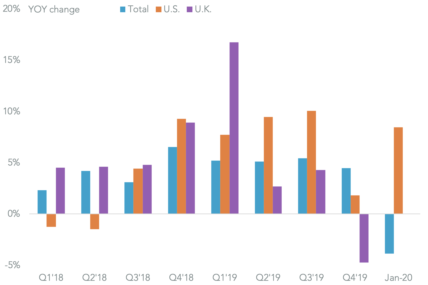 Panjiva’s analysis of Eurostat data shows total exports of PPE reached 12.80 billion euros ($ 13.98 billion) in 2019. Having increased by 4.4% year over year in Q4 they fell by 3.9% in January. The U.S. accounted for 14.3% of the shipments and had seen a surge of 8.5% in January.