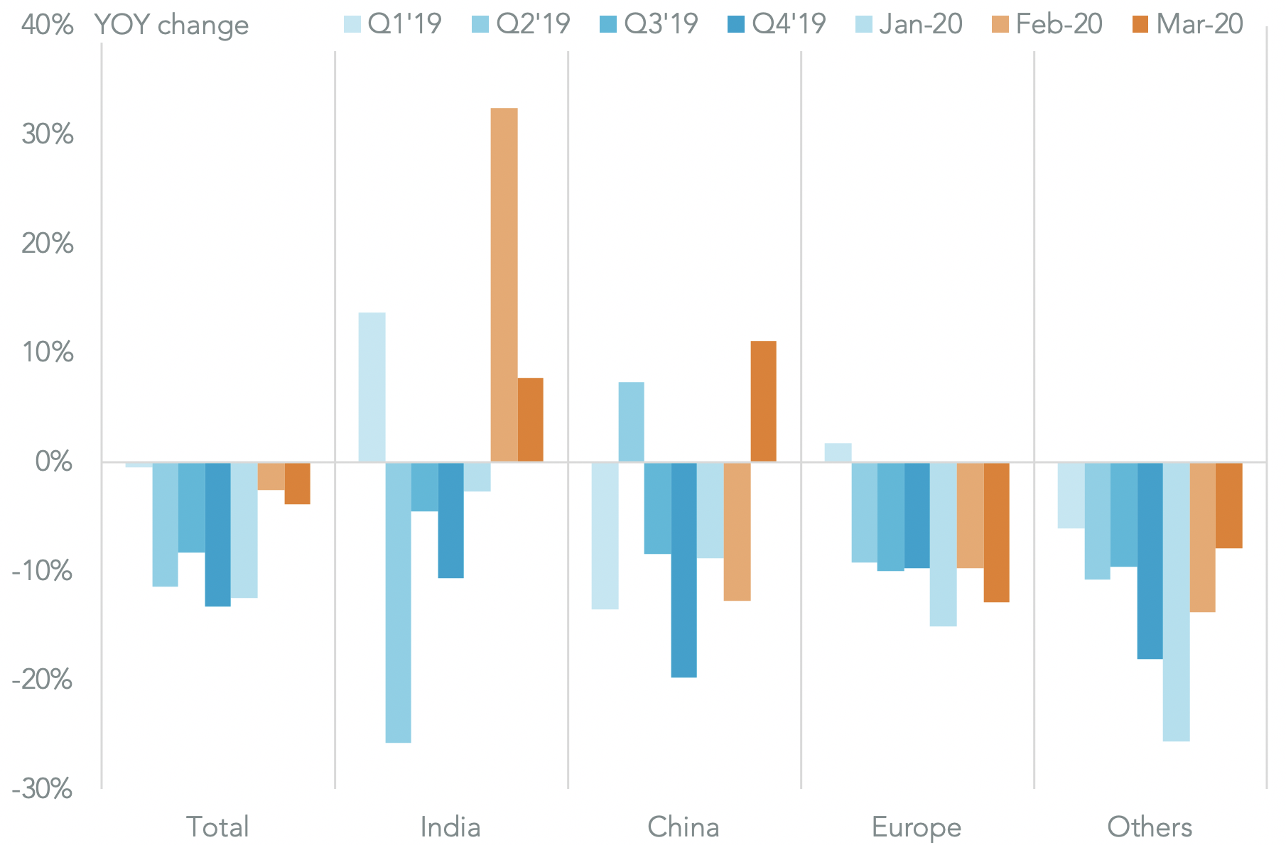 The flow of ventilators and parts to the U.S. has also slumped in the first three weeks of March, with a 33.5% year over year drop in total shipments and a 39.7% slide compared to the daily average for the fourth quarter. Unsurprisingly that’s been led by an 84.7% slide in shipments from China in March versus Q4 as well as a 59.4% drop in shipments from the rest of the world excluding Singapore.