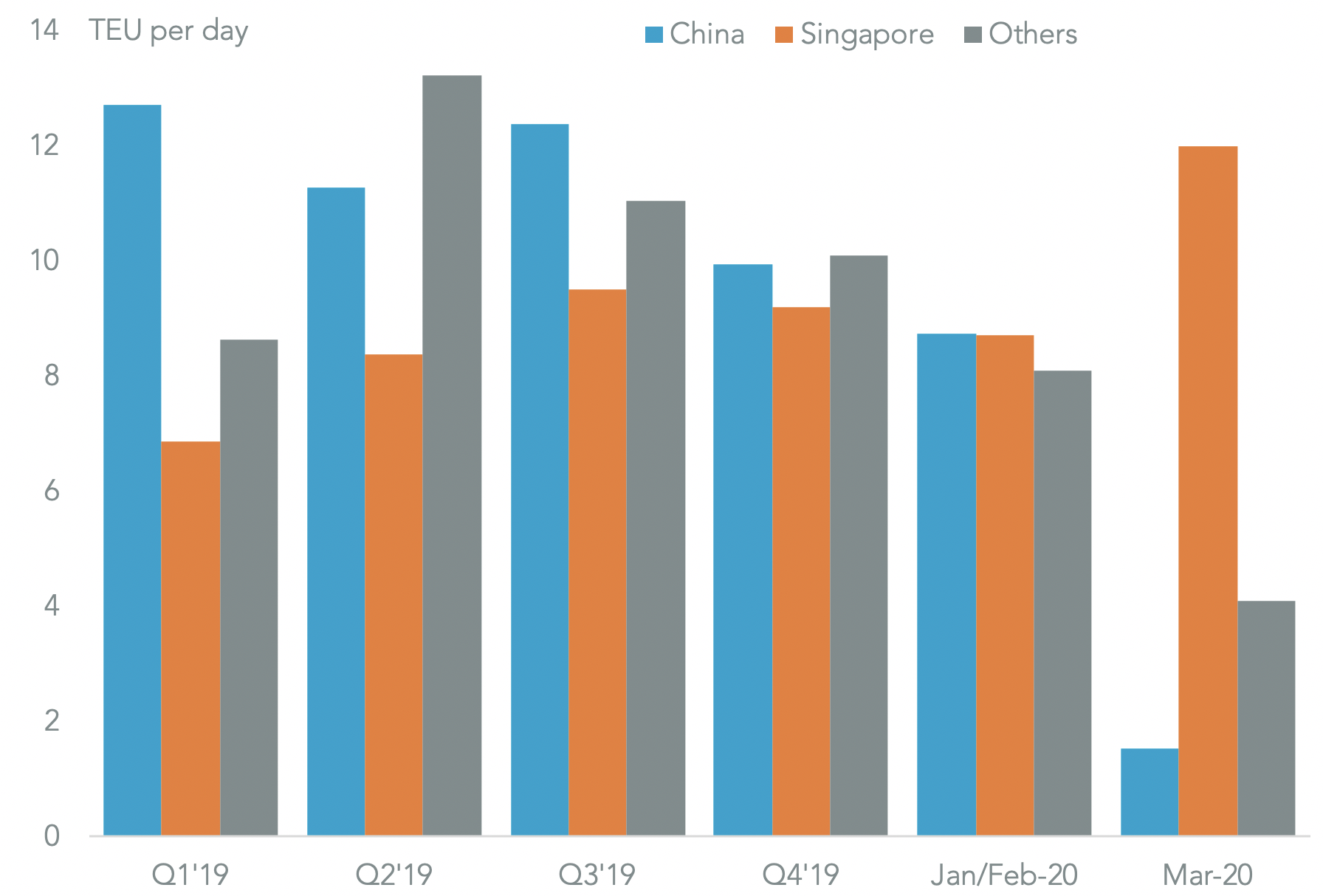 Imports of protective gloves meanwhile fell by 34.1% in the first three weeks of March and those of eyewear dropped 11.7%. It’s worth noting that part of the drop may reflect accelerated shipments by air, though the first major action in “Operation Airbridge” did not occur until after the sample period.